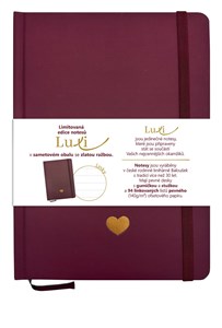 limitovaná edice linkovaného notesu, jedinečný sametový přebal v moderní bordó barvě, zlatý motiv Srdce, kvalitní vysokogramážní papír, 192 stran, 96 listů, notes Luxi se stuhou a gumičkou, vhodný pro psaní, tvoření i plánování, stylový a elegantní zápisník pro každodenní poznámky a myšlenky, rozměry 148×210 mm (A5)