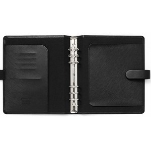 diář Saffiano A5, jednoduchý a sofistikovaný design, desky z imitace kůže s jemnou strukturou a dvojtónovým efektem, zavírání na pásek s patentem, poutko na pero, náplň Classic, papír vhodný pro plnicí pera 80 g/m², nedatovaný roční plánovač, úvodní stránka, rozřazovače, linkované, čisté a tečkované papíry, kontakty, seznam úkolů, barevné linkované papíry, pravítko / záložka, levá strana: 5 kapes na karty, 1 větší kapsa, elastické poutko na pero, pravá strana: kapsa na poznámkový blok, kroužková mechanika 30 mm, výška 236 mm, šířka 210 mm, hloubka 44 mm