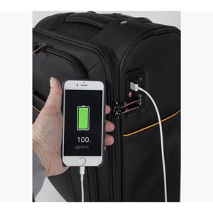 kabinový kufr vhodný jako příruční zavazadlo, je kompatibilní pro většinu leteckých společností, snadná manipulace díky 4 otočným kolečkům a pohodlné teleskopické rukojeti, prostorný interiér s křížovými popruhy, odnímatelná průhledná toaletní taška pro snadnou manipulaci na letišti, samostatné polstrované kapsy na notebook nebo tablet do 15,6“, zavazadlo lze zajistit pomocí vestavěného TSA zámku, součástí tašky je i štítek pro identifikaci majitele, j možné také nabití mobilního telefonu či tabletu pomocí USB portů a integrovaných kabelů (2 USB porty a 1 micro-USB port integrovaný, autonomní nabíječka není součástí), rozměry: 37 x 55 x 23 cm