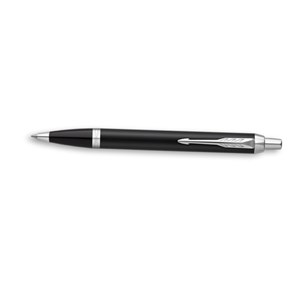 černé kuličkové pero Parker IM Essential má mosazné tělo s matnou lakovanou povrchovou úpravou, v kombinaci s doplňky pokovenými chromem, stiskací mechanismus, modrá náplň pro kuličková pera, délka psaní 3500 m, šíře stopy 1 mm