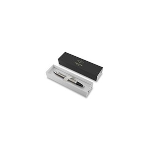 kuličkové pero Parker IM Essential Stainless Steel CT má tělo z broušené nerezové oceli, v kombinaci s doplňky pokovenými chromem, stiskací mechanismus, modrá náplň pro kuličková pera, délka psaní 3500 m, šíře stopy 1 mm