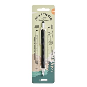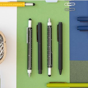 multifunkční kuličkové pero 5v1, kuličkové pero, pravítko v cm i palcích, vodováha, plochý a křížový šroubovák, dotykový stylus pro tablety a smartphony, modrá náplň, inkoust na olejové bázi, černá barva, stiskací mechanika, balení v blistru, rozměry 155 × Ø 13 mm