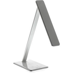 atraktivní stolní lampa s bezdrátovým (Qi) nabíjením a USB výstupem, 48 LED čipů Epistar 4014 (5 W, 250 lm), volitelná teplota světla 3000K / 4000K / 5000K / 6000K, CRI > 80, dotykové ovládání a kroková regulace jasu, časovač 60 / 90 min, nastavitelná hlava 180° a rameno 90°, životnost až 50 000 hodin, napájení DC 5 V / 2500 mA (adaptér součástí), účinnost nabíjení 75 %, nabíjecí vzdálenost 8 mm, barva bílá