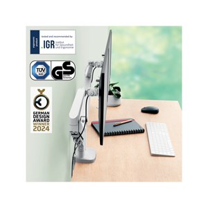 Duální rameno Leitz s certifikací IGR a TÜV zlepšuje držení těla, podporuje správné nastavení výšky očí a ulevuje krku a ramenům. Stabilní v jakékoli poloze, snadno přepíná mezi orientací na šířku a výšku. Ideální pro malé pracovní prostory – skládací, flexibilní a nastavitelné jednou rukou.
