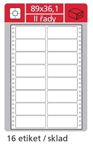 Samolepicí tabelační etikety S&K Label o rozměrech 89 x 36,1 mm jsou navrženy pro použití v jehličkových tiskárnách. Jsou umístěny na nekonečném pásu skládaných listů s postranní vodicí perforací, která zajišťuje přesné vedení pásu v tiskárně. Balení obsahuje 8 000 etiket ve dvouřadém uspořádání.