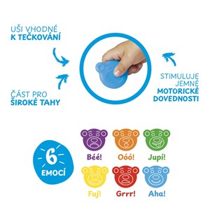 roztomilé voskovky ve tvaru medvídka, ideální pro děti od 12 měsíců, ergonomický tvar podporuje správný úchop a usnadňuje první kreativní pokusy, každá barva spojena s emocí pro zábavu a poznávání, uši medvídka tvoří hravé tečky, široká část umožňuje kreslit dlouhé tahy, jasné a zářivé barvy, podpora nácviku úchopu a rozvoj motoriky, neobsahuje TiO2, obsah balení 12 ks