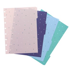 Plánujte a užívejte si! Dodejte Vašemu Filofax Notebook více elegantnosti s touto barevnou sadou čtyř odolných plastových rozřazovačů z naší kolekce Garden, které jsou speciálně navržené, aby ladily s Vašim plnitelným zápisníkem Filofax Notebook A5. Tato sada obsahuje oboustranně potištěné rozřazovače v barvách růžová, modrá, fialová a zelená.